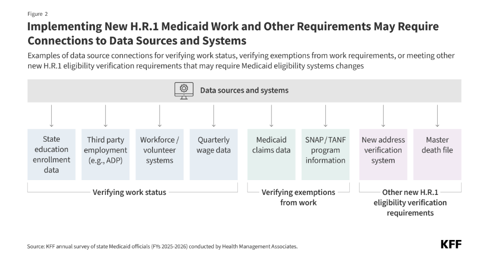 States cited the need to make major changes to eligibility systems in a short timeframe and the need for enhanced data sharing infrastructure as major challenges. States will need to make significant changes to eligibility systems to be able to verify compliance with work, school, and other qualifying activities as well as to identify individuals who qualify for mandatory exemptions and optional exceptions. States expressed concern over having to make such major system changes in a very short timeframe, noting the long lead times typically needed to design, procure, and build new systems. Adding to the challenge will be the need to make key system design and workflow decisions before CMS releases guidance. Another priority many states mentioned is enhancing capabilities to collect and match data from multiple agencies and external sources (e.g., SNAP, Medicaid claims data, state education enrollment data) to reduce the burden on applicants and enrollees for documenting their work or exemption status (Figure 2). However, some states acknowledged that data sharing infrastructure is limited and establishing interfaces to accurately share data will take time to put in place.
