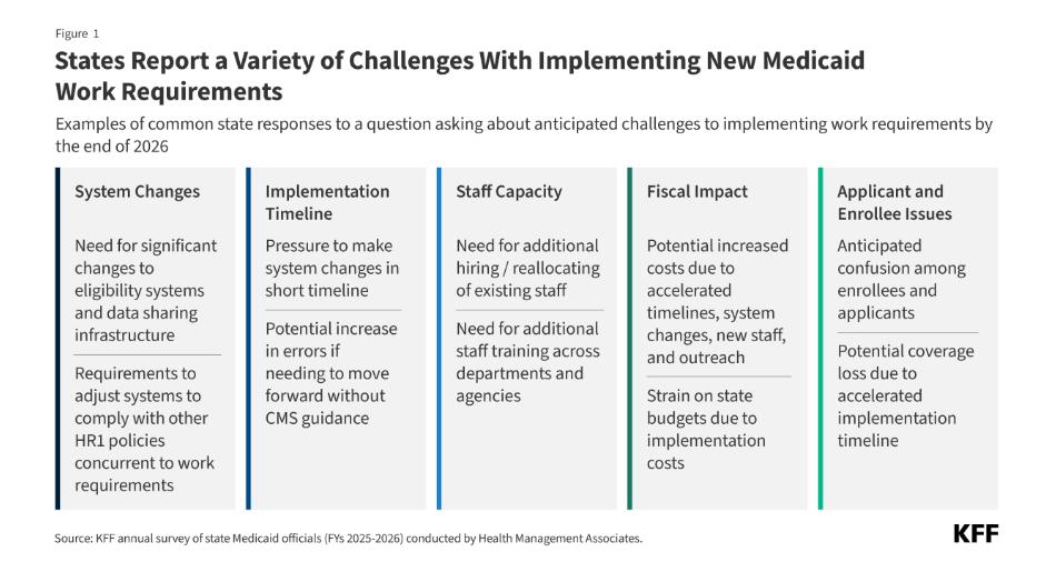 In the summer of 2025 while the new law was under debate in Congress and shortly after enactment, the 25th annual budget survey of Medicaid officials in all 50 states and the District of Columbia conducted by KFF and Health Management Associates (HMA), in collaboration with the National Association of Medicaid Directors (NAMD) was in the field. To better understand how states are preparing for Medicaid work requirements, the survey asked states to discuss anticipated challenges to implementing work requirements by the end of 2026, including related system changes and data matching. KFF anticipates that work requirements will apply to 43 states (41 expansion states including the District of Columbia plus Georgia and Wisconsin, which have expanded Medicaid through waivers). We received responses to this question from 42 of these states.