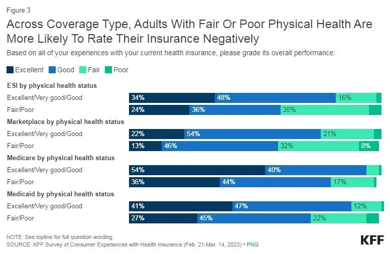 Adults with “fair” or “poor” physical health are nearly twice as likely as those with at least “good” physical health to give their insurance a negative rating on its overall performance (31% vs. 16%).