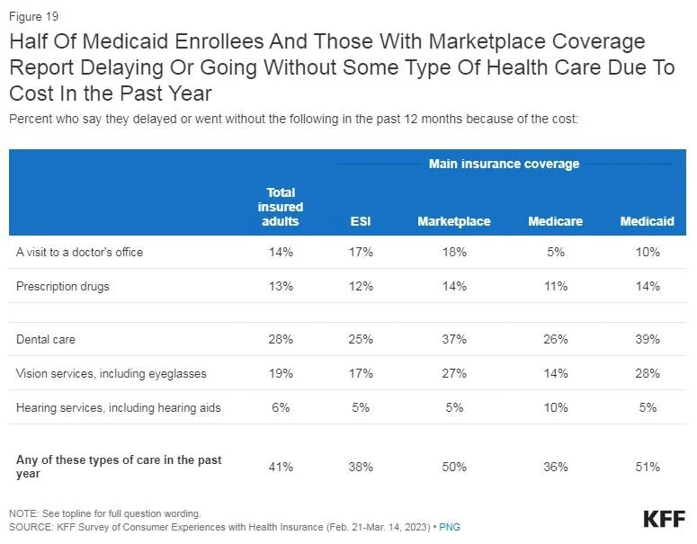 In total, about four in ten insured adults say they have delayed or gone without a visit to the doctor’s office, vision services, hearing services, prescription drugs or dental care within the last year because of the cost, including half of those with Marketplace coverage and half of Medicaid enrollees. Delayed or skipped care could be due to the cost of having to pay for the deductibles or copays, or the out-of-pocket cost for care not covered by insurance at all.