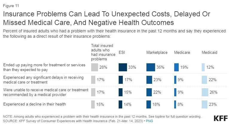Nearly half of insured adults who had insurance problems were unable to satisfactorily resolve them, with some reporting serious consequences. Half of consumers with insurance problems say their problem was resolved to their satisfaction. Among the 58% of insured adults who had a problem with their insurance in the past year, about one in six (17%) say they were unable to receive recommended care as a direct result of their problems; 15% say they experienced a decline in their health and about three in ten (28%) say they paid more than they expected for care all as a direct result of their problems.