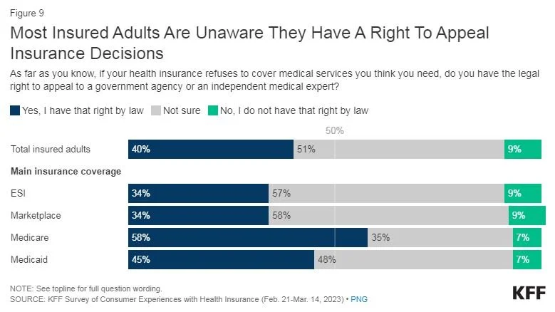 Four in ten insured adults (40%) know they have a legal right to appeal to a government agency or an independent medical expert if their health insurance refuses to cover medical services they think they need. A small share incorrectly believe they do not have appeal rights (9%), while about half (51%) say they are not sure. With the exception of people with Medicare, majorities across insurance types say they do not know or believe they do not have appeal rights if their insurance refuses to cover medical services they think are needed.