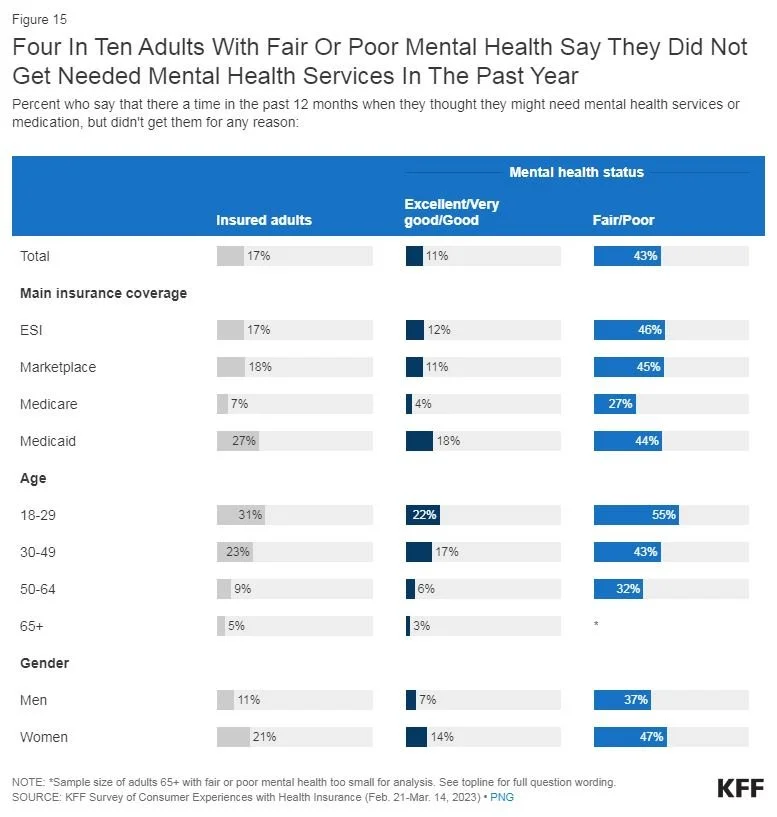 More broadly, among all insured adults, about one in six (17%) say that there was a time in the past year when they thought they might need mental health services or medication but didn’t get them. This includes one in four Medicaid enrollees (27%), one in seven insured adults with Marketplace coverage (18%) or ESI coverage (17%), and fewer than one in ten (7%) adults with Medicare.