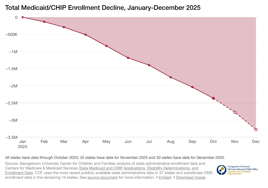 Data so far indicate that Medicaid/CHIP enrollment declined by approximately 3.3 million individuals (or 4.0%) during 2025. While this rate of decline is more modest than in the previous two years, it still marks the third straight year of enrollment declines following the unwinding of the pandemic-era continuous coverage protections which began April 1, 2023. (Nationally, enrollment declined by about 8% between December 2022 and December 2023 and by 7% between December 2023 and December 2024). Importantly, the child uninsured rate went up from 5.1% in 2022 to 6.0% in 2024 as we documented in our annual child coverage report. The majority of children losing coverage during unwinding were expected to remain eligible. The adult uninsured rate did not change in 2024.